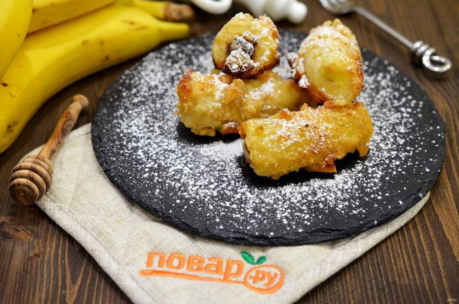Этот десерт для любителей очень-очень сладкого! Все здесь сладко: и сами бананы, и шоколадная паста. Подается десерт с сахарной пудрой. Любители сладенького, знакомьтесь с рецептом!