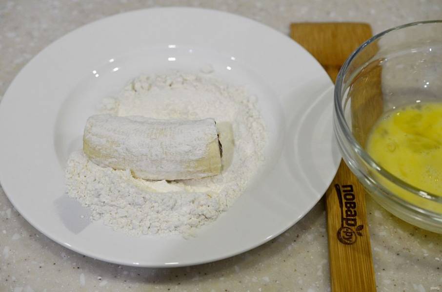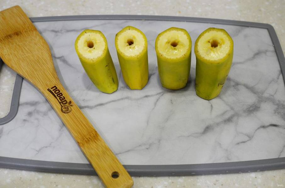 2. Узким длинным ножом сделайте в середине каждого банана отверстие.