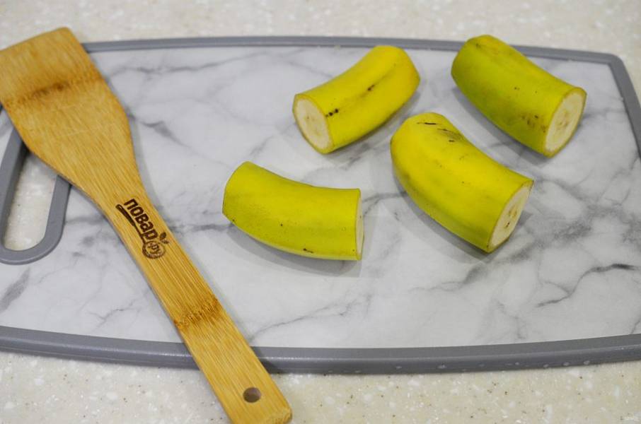 1. Бананы должны быть немного неспелые. Не очищая, разрежьте банан на 2-3 части.