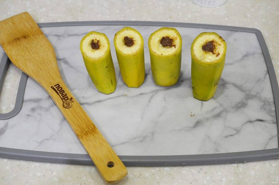3. С помощью кондитерского мешка или шприца начините бананы шоколадной пастой.