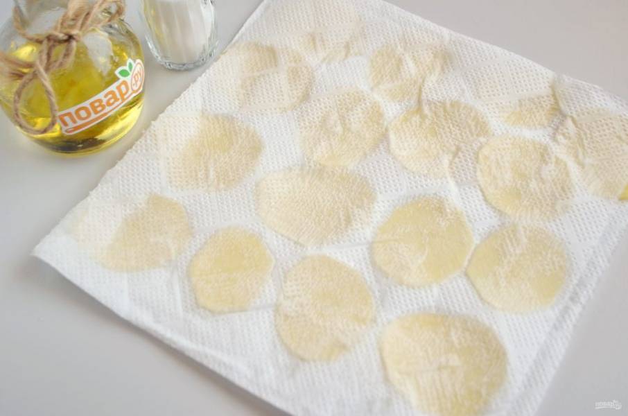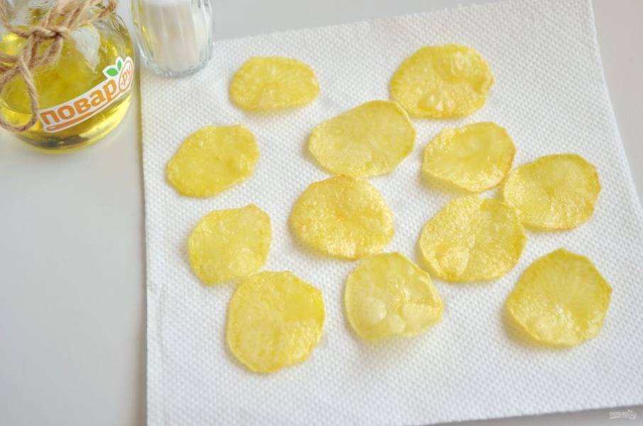 7. Чипсы выкладывайте со сковороды на бумажные полотенца, чтобы убрать лишний жир.