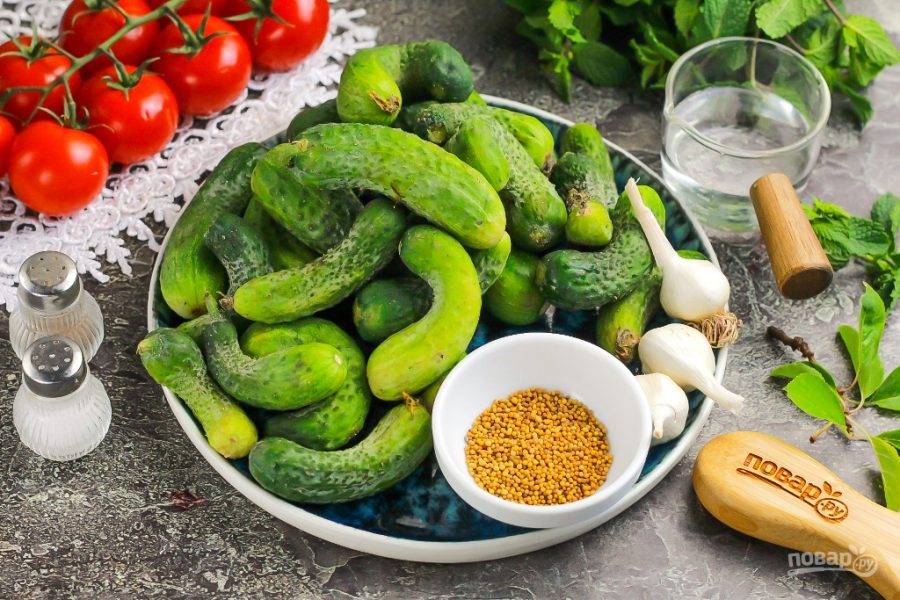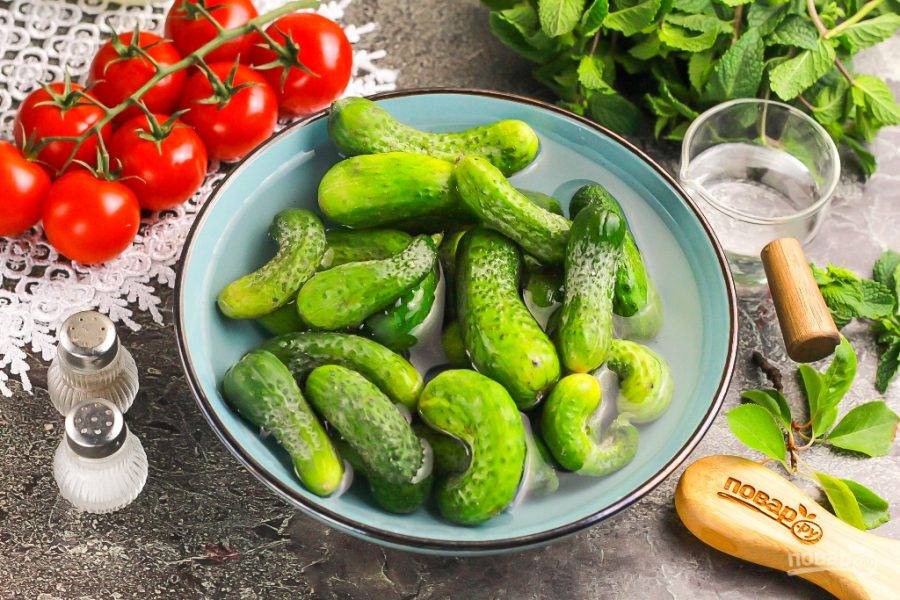 Подготовьте указанные продукты. Приобретите небольшие плотные огурцы, следя за тем, чтобы на плодах не было потемнений и вмятин.