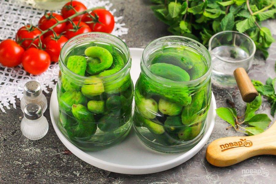 Залейте в емкости кипяток и оставьте на 10-15 минут. Заливать нужно до верха, чтобы все огурцы оказались в жидкости.