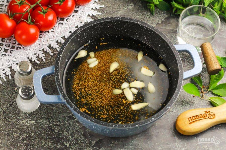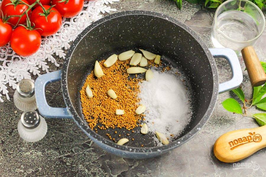 Всыпьте соль и зерна горчицы в ковш или казан. Очистите зубчики чеснока и добавьте туда же.