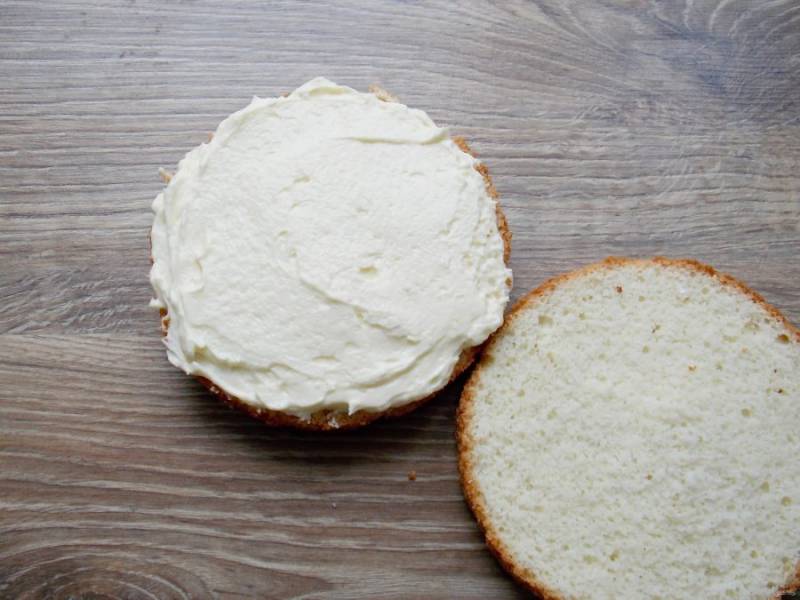 Теперь соберите торт. Бисквит разрежьте на два коржа. Нижний корж смажьте масляным кремом.