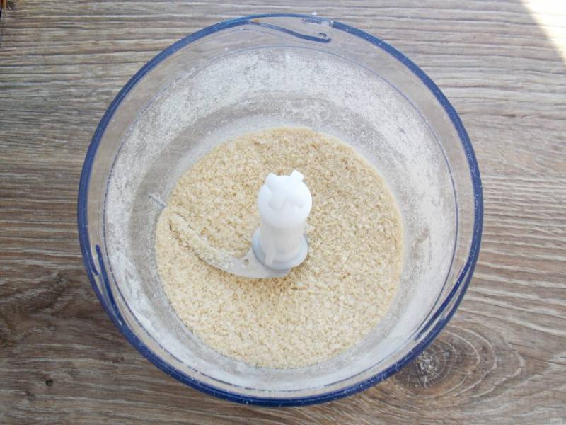 Вафельные коржи поломайте, выложите в чашу блендера и измельчите в мелкую крошку.
