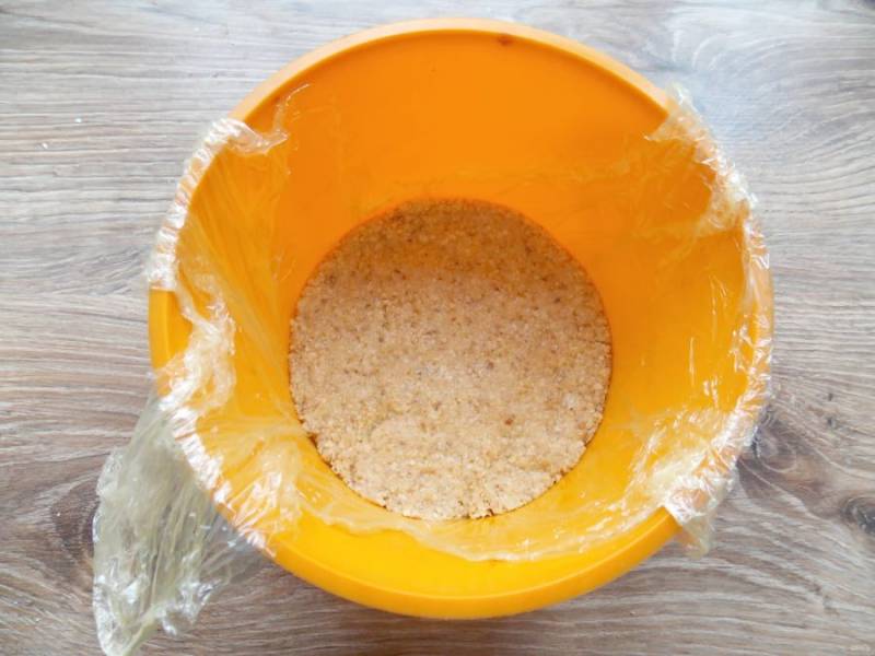 Форму застелите пищевой пленкой и выложите туда массу, плотно ее утрамбуйте. Слой должен быть не толще 1 сантиметра, иначе торт будет сложно разрезать. Размер хрустящего слоя должен быть такой же, как и размер коржей для торта.