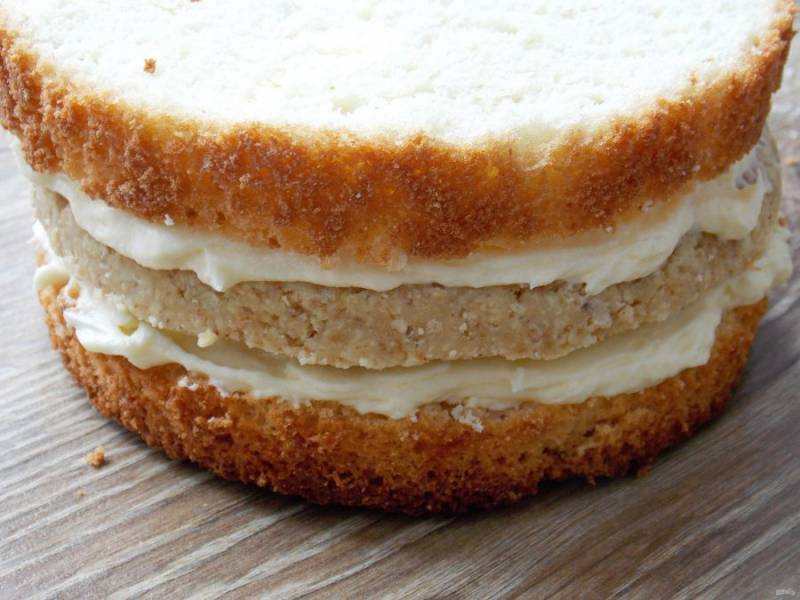 Покройте кремом бока и поверхность торта. Обсыпьте бока измельченным грецким орехом.