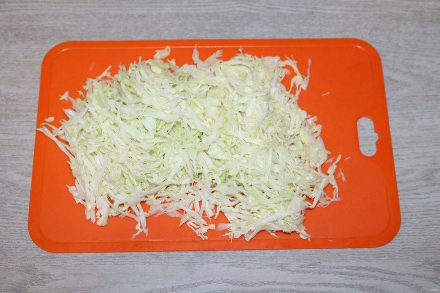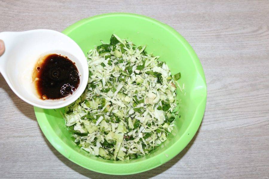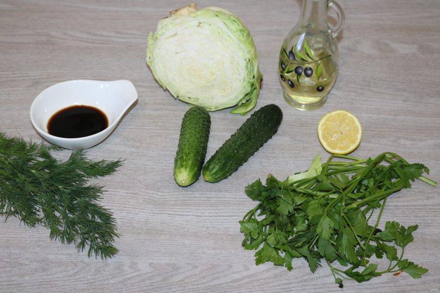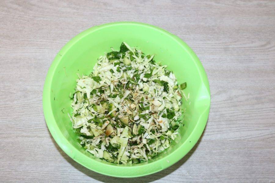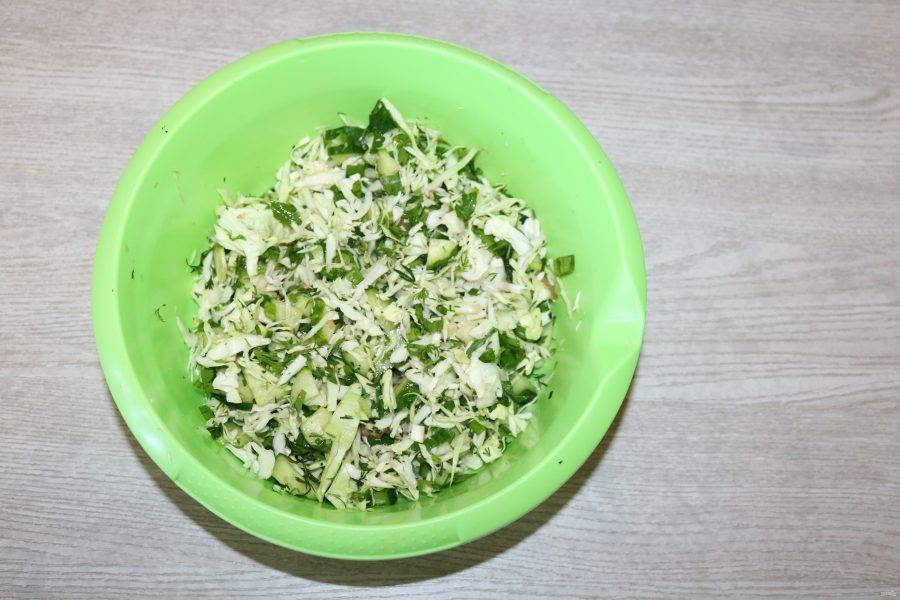 В салатнике соедините нарезанную капусту, огурцы и мелко нарезанную зелень.