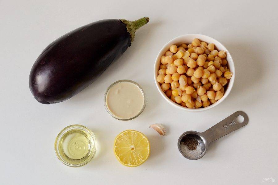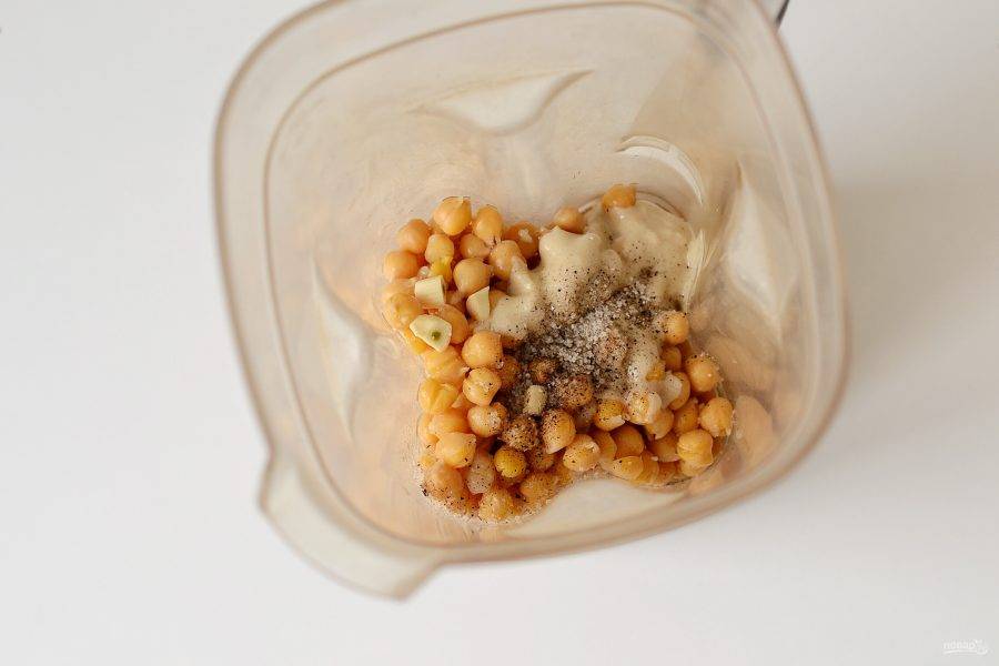 В блендере измельчите нут, чеснок, тахини, лимонный сок, специи, соль и растительное масло.