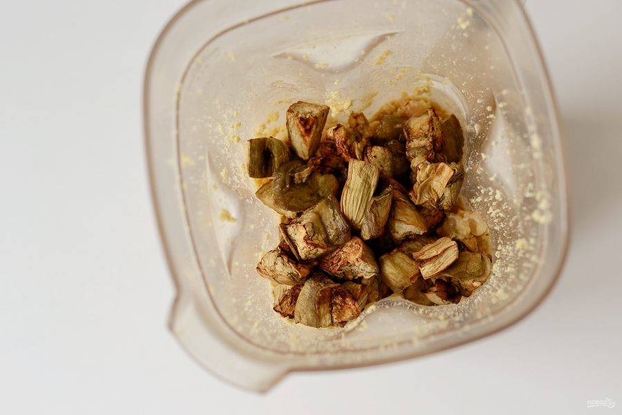 Добавьте запеченные кусочки баклажана и снова измельчите до однородной консистенции.