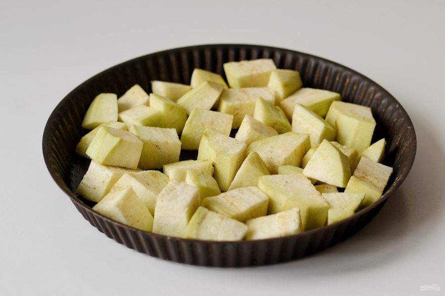 Срежьте кожуру у баклажана, затем нарежьте крупными кусочками. Запекайте баклажан при температуре 200 градусов до мягкости около 30-40 минут.
