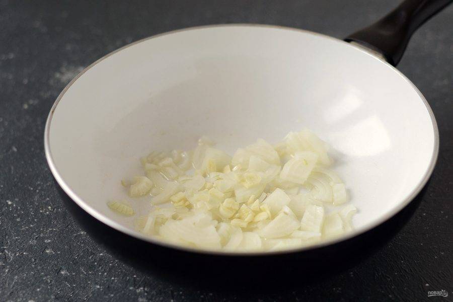 Лук нарежьте полукольцами, чеснок мелко порубите. Обжарьте в сковороде с маслом (2 ст.л.) до золотистого цвета.
