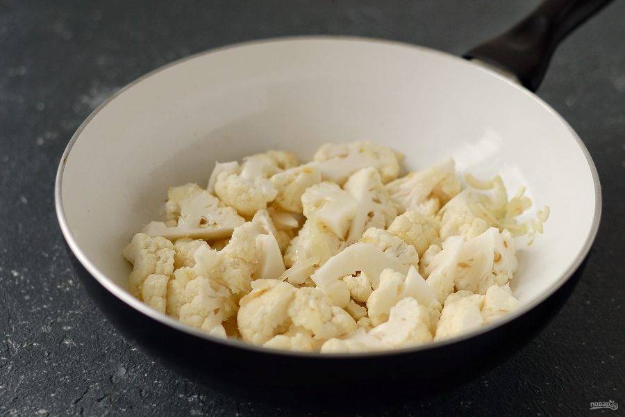 Цветную капусту помойте, разберите на соцветия. Добавьте к жареному луку и чесноку, готовьте до мягкости примерно 8-10 минут, под крышкой.
