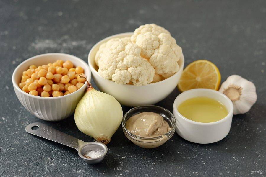 Измельчите до однородной консистенции цветную капусту, лук, чеснок, нут, лимонный сок и пасту тахини.