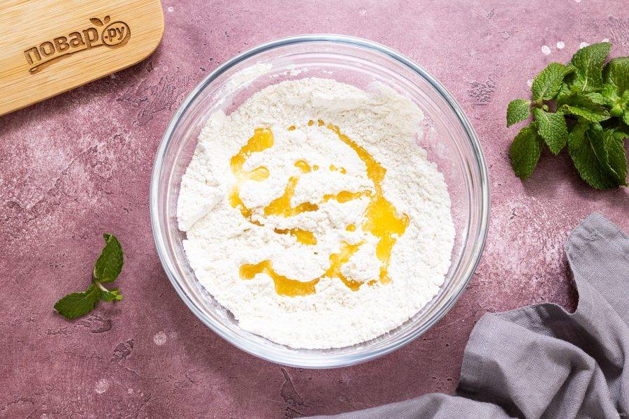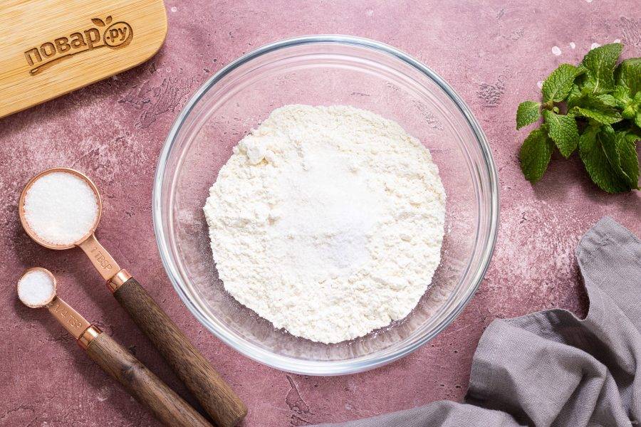В глубокую миску просейте пшеничную муку. Добавьте соль и сахар, перемешайте.