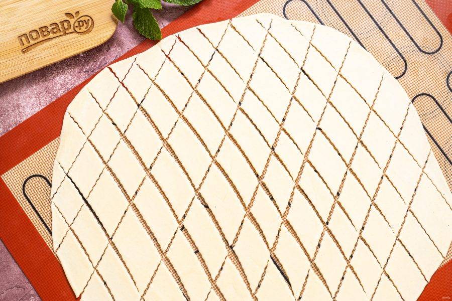Раскатайте тесто в пласт толщиною примерно 1.5-2 мм.
