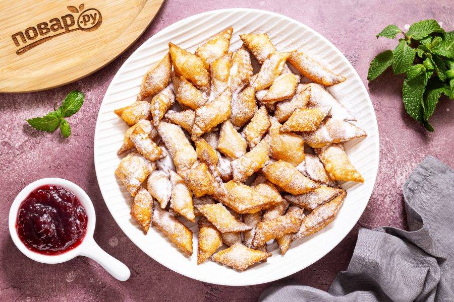 Перед подачей можно посыпать хворост сахарной пудрой. Хворост без яиц готов, приятного вам аппетита!