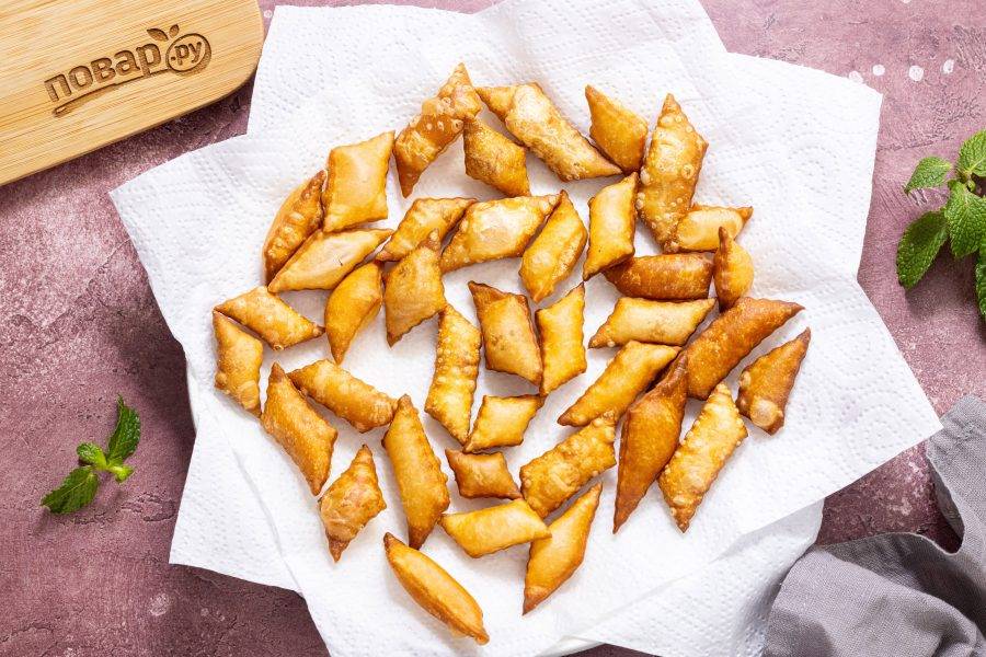 Готовый хворост выложите на бумажные полотенца, чтобы впиталось лишнее масло.