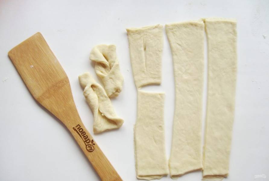 Нарежьте полосками длиной приблизительно 10 см. и шириной 4-5 см. В каждой полоске сделайте надрез. После проденьте один конец полоски в разрез. Готово.