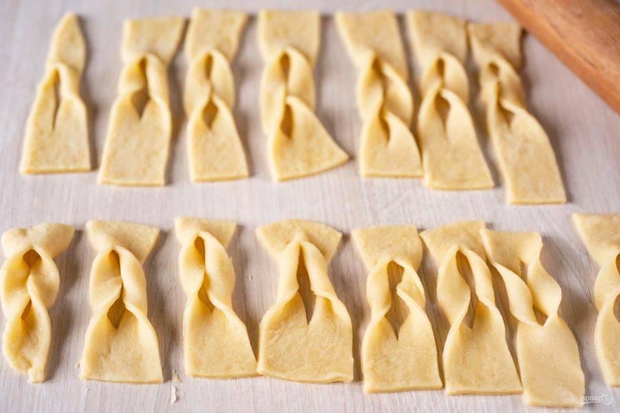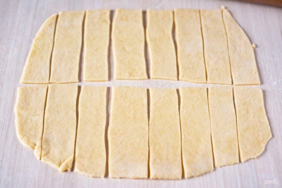 Затем чуть припылите рабочую поверхность мукой и раскатайте тесто скалкой в тонкий (толщина 1-2 мм) пласт, нарежьте на прямоугольники-ленты.