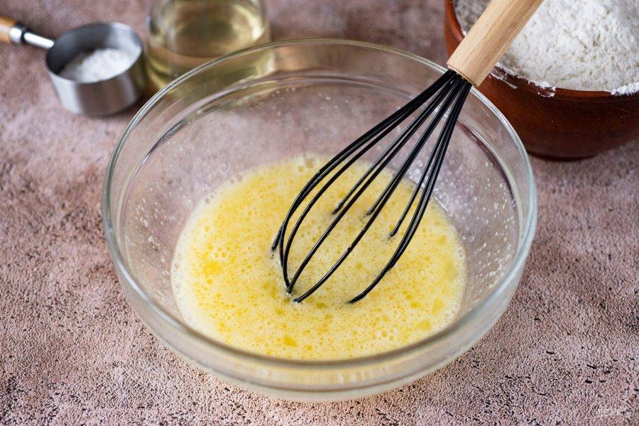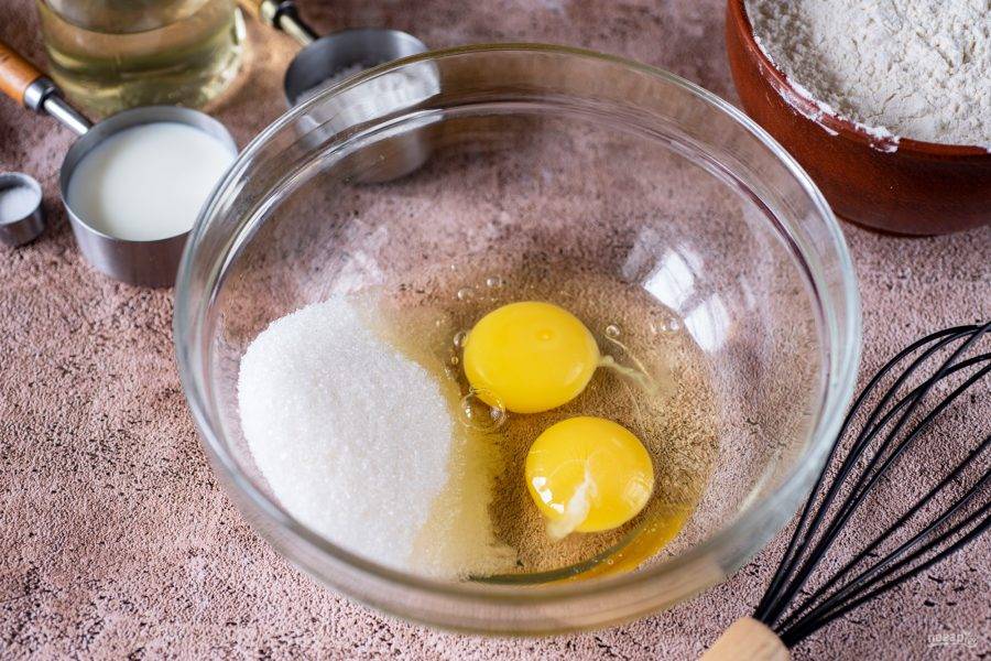 Для приготовления теста в просторную миску вбейте яйца и добавьте сахар.
