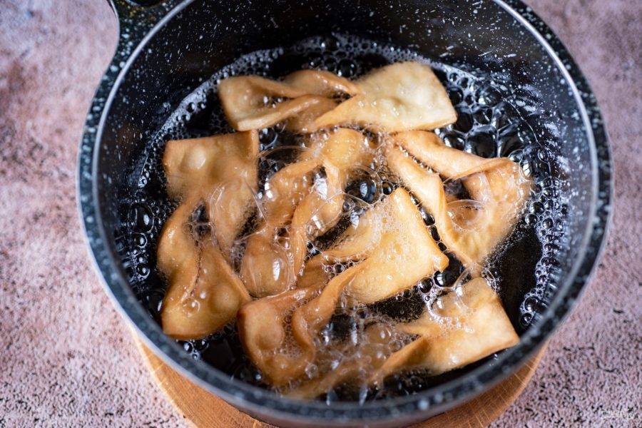 В удобном сотейнике разогрейте на среднем огне обильное количество растительного масла и выложите партию заготовок хвороста, обжаривайте до аппетитного золотистого оттенка, после чего выловите шумовкой готовый хворост из масла и выложите сначала на бумажное полотенце, избавляясь от излишков масла.