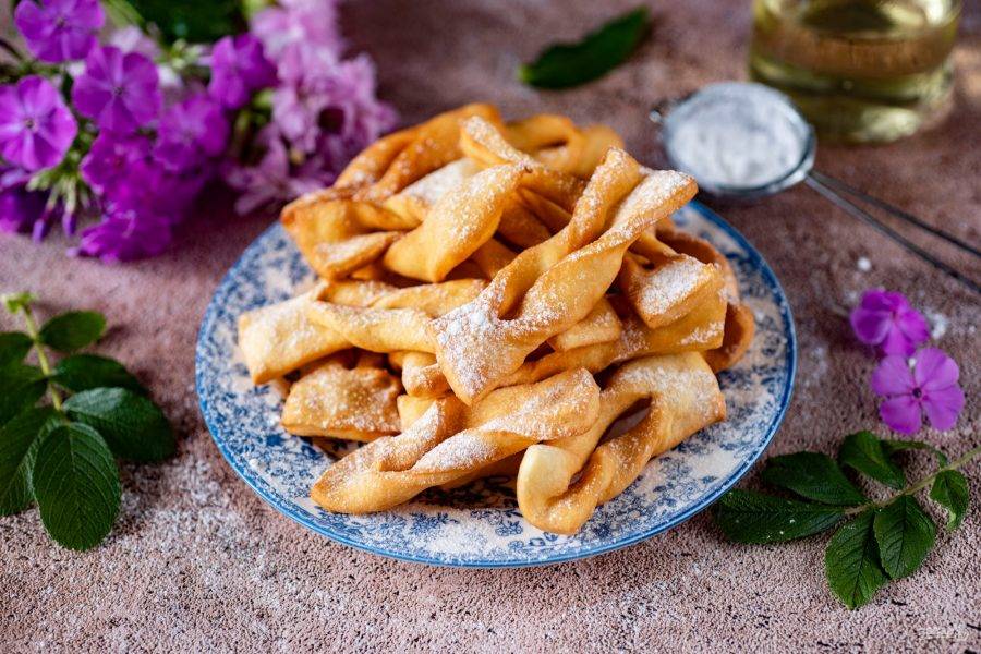 Затем переложите хворост на тарелку для подачи к столу и присыпьте по вкусу сахарной пудрой.