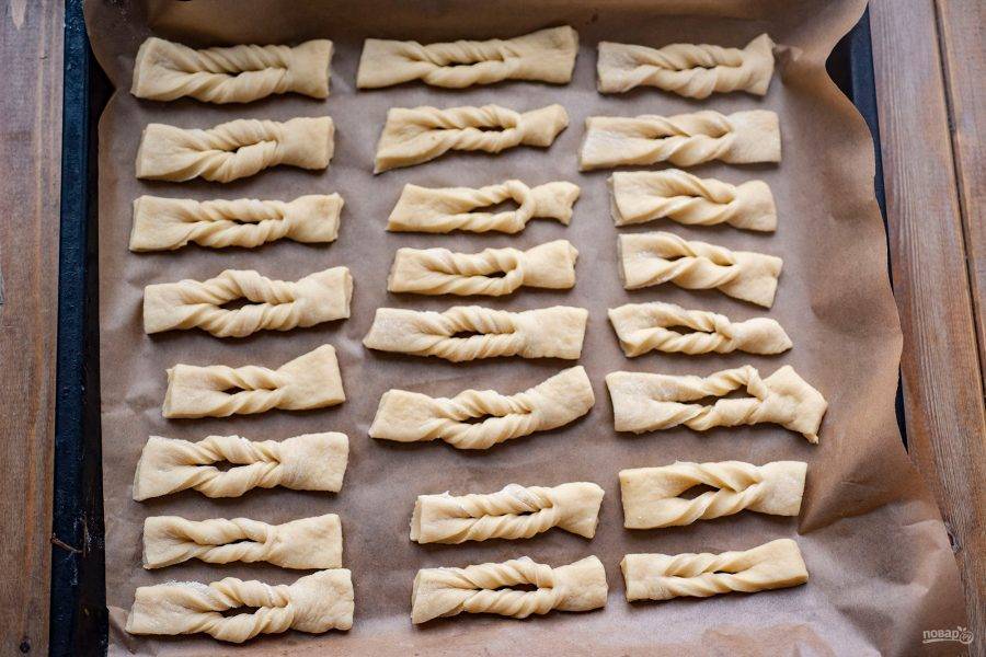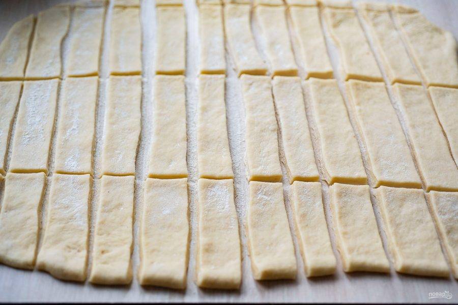 Рабочую поверхность припылите мукой и раскатайте тесто в пласт толщиной примерно в 1-2 мм. Нарежьте пласт теста на полосы шириной в 2-3 см. Затем каждую полосу нарежьте в форме прямоугольника.