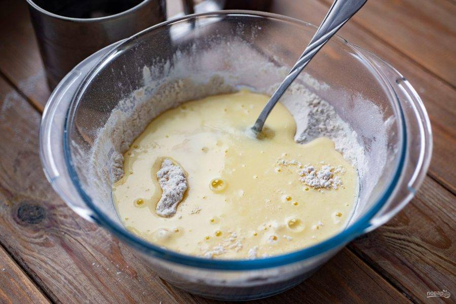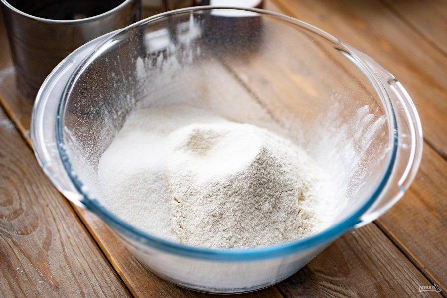 В отдельную сухую миску просейте муку, добавьте соль, сахар, соду. Перемешайте эти ингредиенты.
