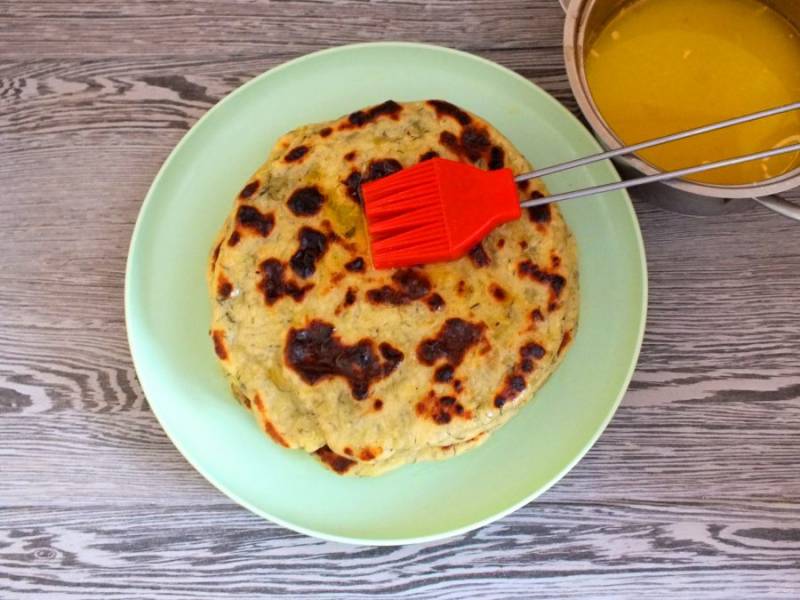 Лепешки складывайте на блюдо. Растопите сливочное масло. Каждую лепешку обильно смажьте маслом.