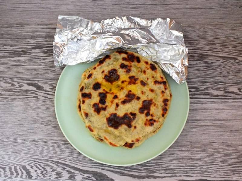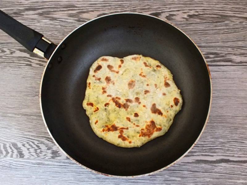 Разогрейте сковороду. Обжарьте на сухой сковороде с двух сторон подготовленные лепешки.