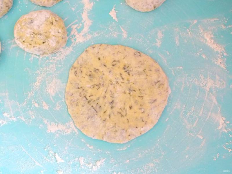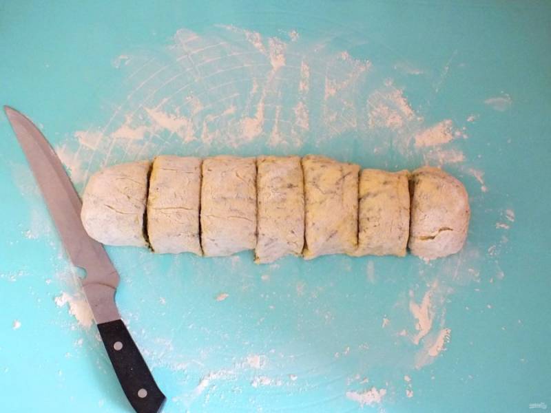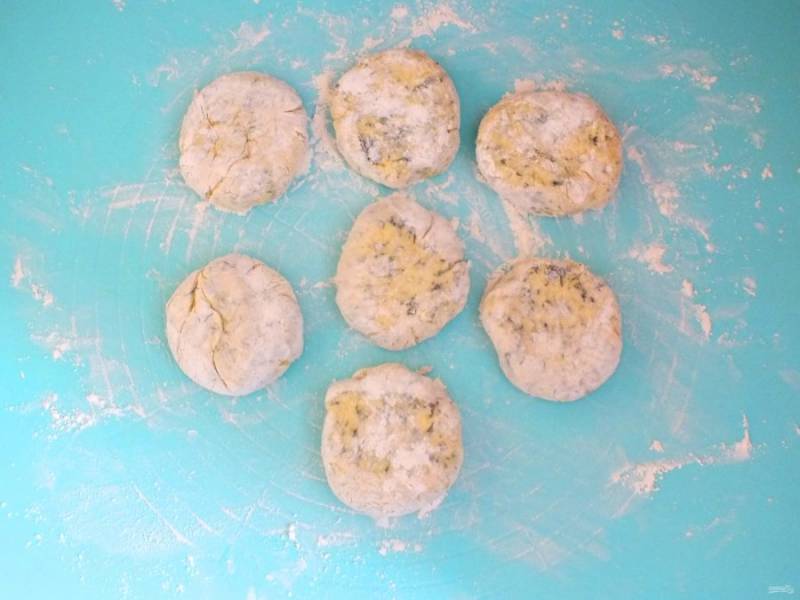 Каждую часть обсыпьте мукой и прижмите слегка рукой, придав округлю форму.