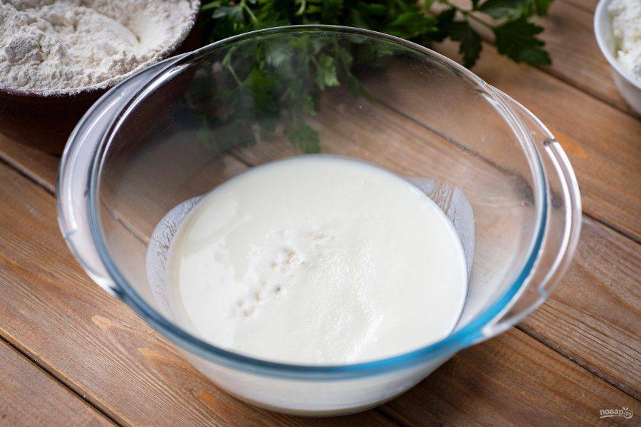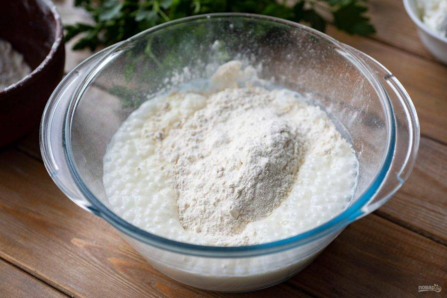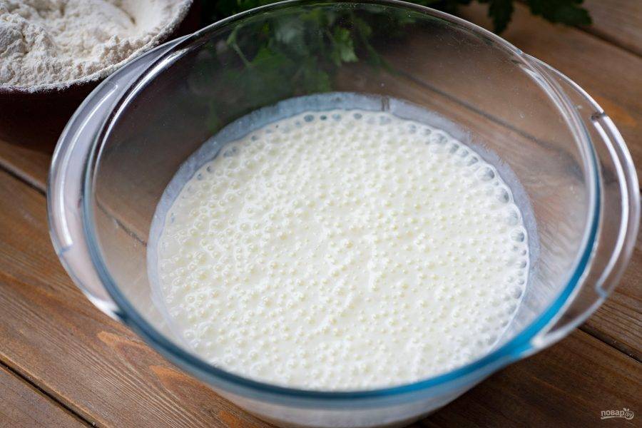 Дождитесь, когда сода войдет в реакцию с кефиром — масса запузырится.