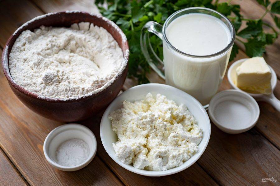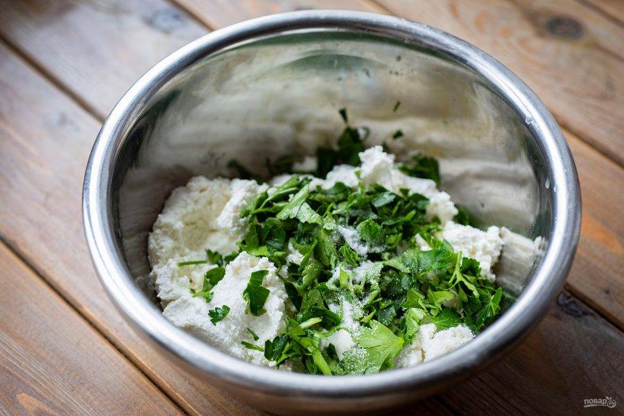 В отдельную миску выложите весь творог, добавьте соль, мелко порубленную петрушку.