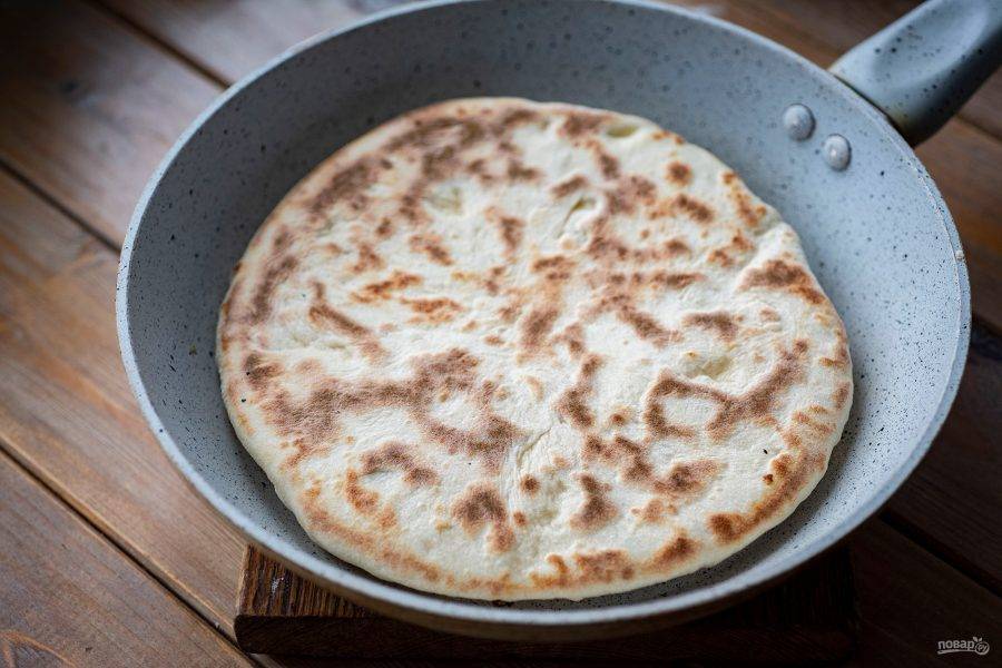 Обжарьте лепешку на сухой сковороде до круглых подпалин с двух сторон.