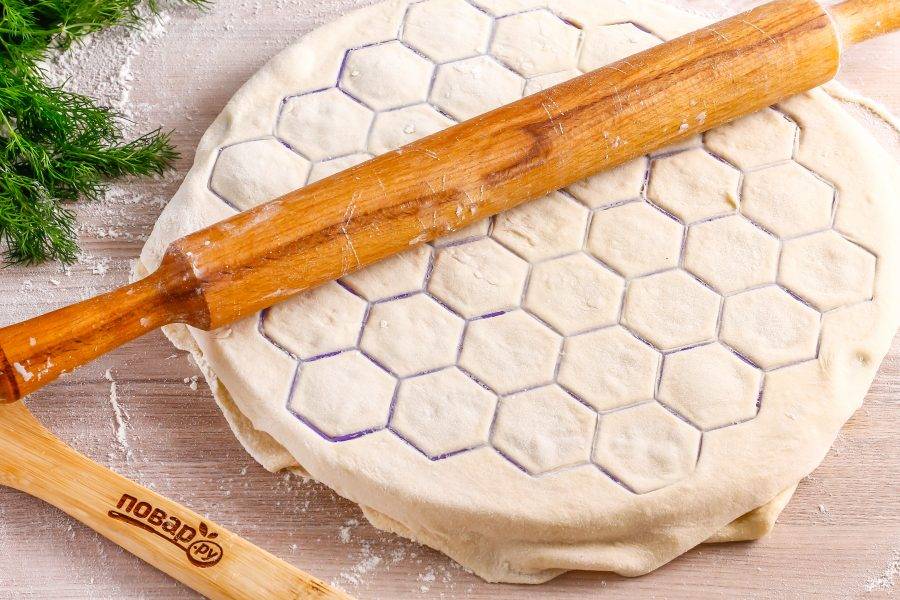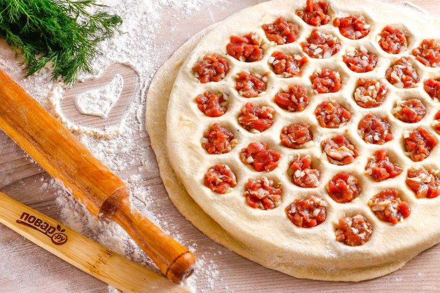 Тонко раскатайте вторую часть теста и выложите на ячейки с фаршем, выпустите воздух. Присыпьте мукой и с усилием пройдитесь по тесту скалкой, чтобы разделить заготовки.
