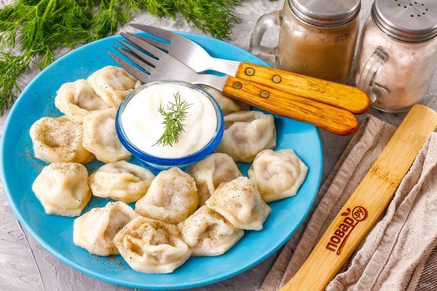 С помощью шумовки выложите ароматные пельмени на тарелку, подайте к столу со сметаной или другим соусом, присыпав молотым черным перцем.