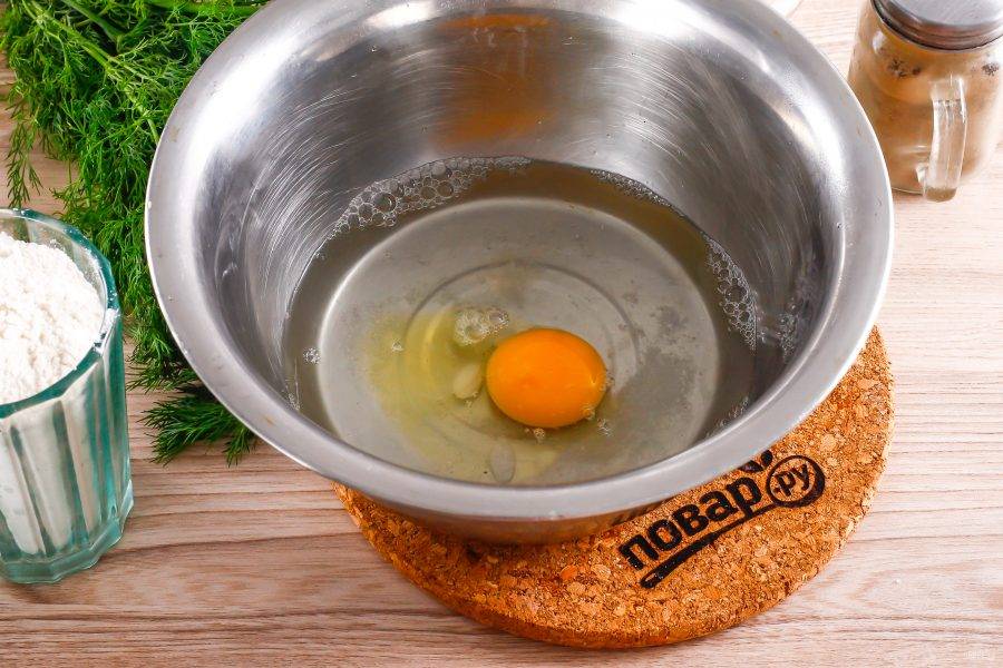 В глубокую емкость влейте воду и вбейте туда же куриное яйцо. Всыпьте соль и тщательно взбейте.