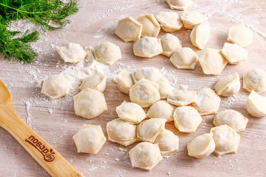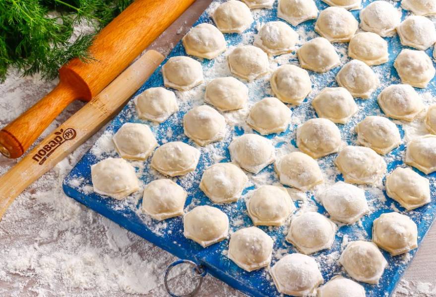 Удалите лишние обрезки теста и переверните пельменницу, слегка постучите ей по столу и заготовки попадают из нее сами.