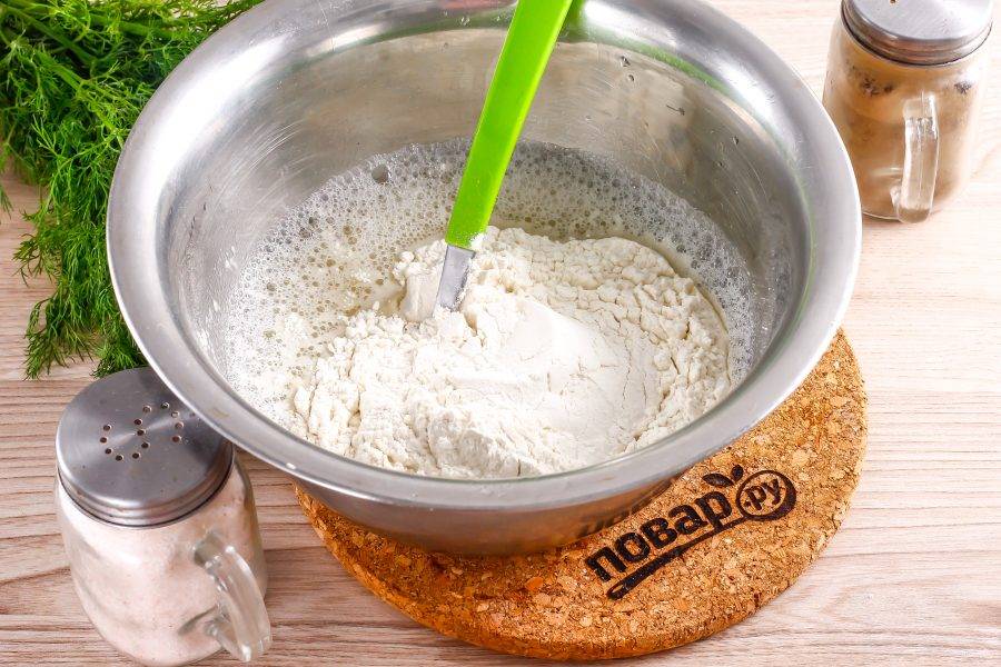Всыпьте пшеничную муку и замесите тесто, стараясь не забивать его мукой и не слишком вымешивать, иначе оно будет жестким. Накройте колобок теста полотенцем и оставьте на 15-20 минут для активации клейковины. Не дав тесту отдохнуть, вы не сможете его тонко раскатать — оно будет рваться.