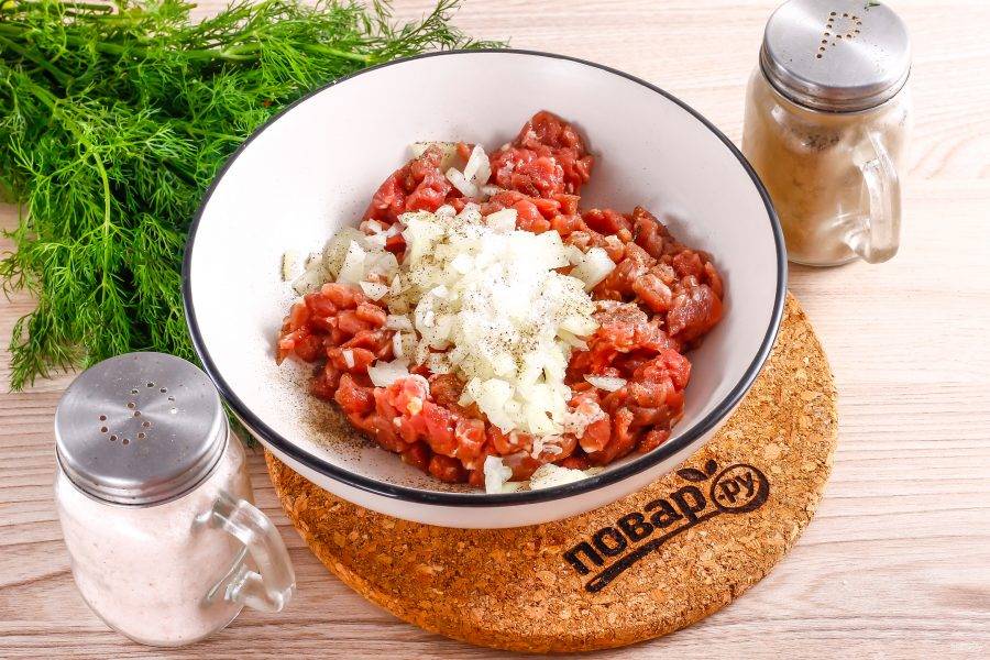 Тем временем говядину нарежьте мелкими кубиками или же приобретите рубленый говяжий фарш. Можно использовать баранину или свинину, но самые вкусные пельмени — из говядины! Очистите, промойте и нарежьте такими же кубиками репчатый лук. Добавьте в емкость к фаршу вместе с солью, молотым черным перцем. Аккуратно перемешайте и оставьте на 15 минут.