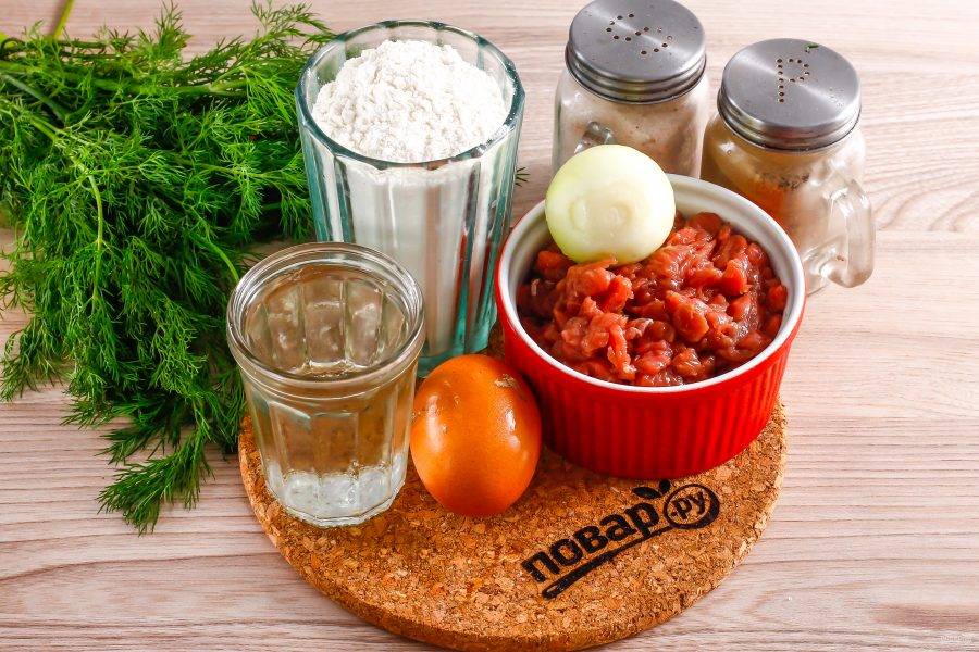 Подготовьте указанные ингредиенты. Говяжий фарш лучше всего приобретать слегка жирноватый, чтобы начинка не получилась суховатой на вкус.