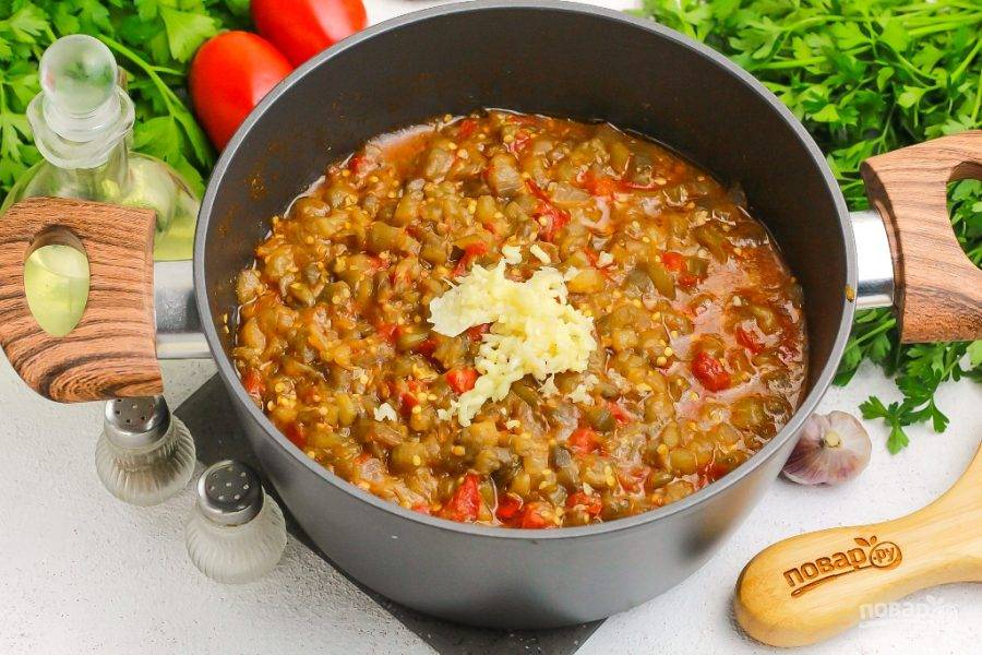 Поэтому спрессуйте очищенные зубчики чеснока в емкость, перемешайте и протомите еще 2-3 минуты. Выключите нагрев, оставьте икру под крышкой в емкости на 10 минут для пропаривания - она полностью вберет в себя чесночный аромат. На этом этапе если вы захотите ее заготовить на зиму, то нужно всыпать сахар и влить уксус, проварить 3-5 минут и разложить по банкам.