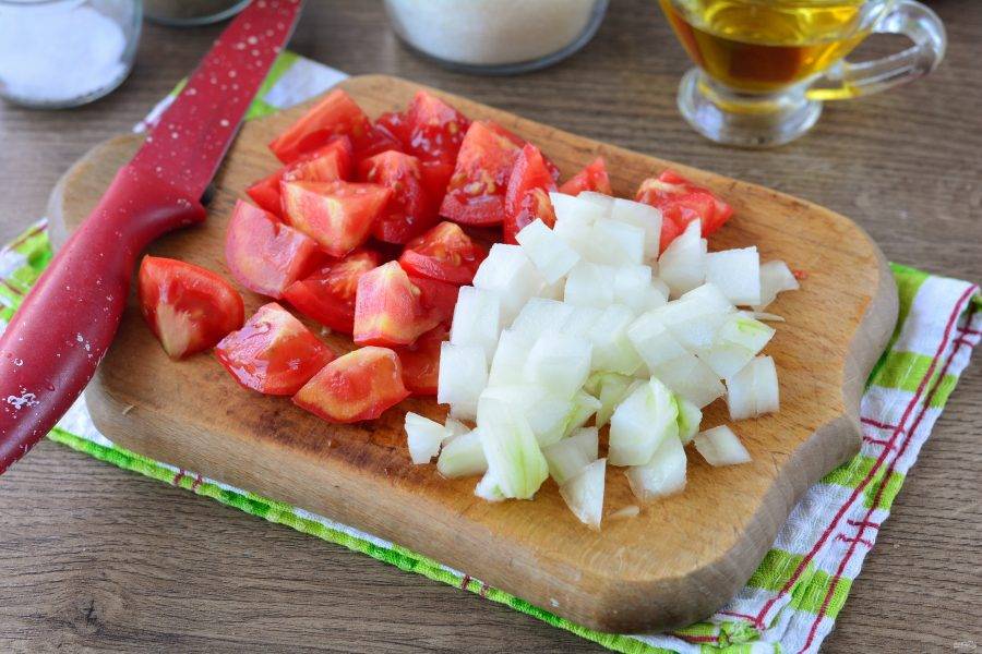 Почистите репчатый лук и нарежьте кубиками. Вымытые помидоры нарежьте средними кусочками.