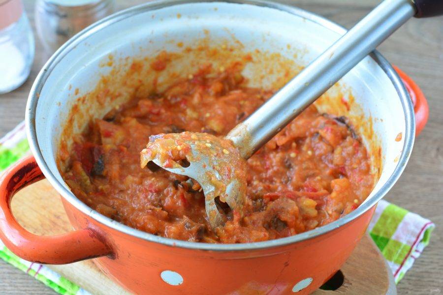 Взбейте овощи при помощи погружного блендера до состояния икры. Можете взбивать до желаемой густоты и консистенции. Кто-то любит, чтобы в икре попадались небольшие кусочки овощей. Икру верните на огонь, доведите до кипения и выключите плиту.