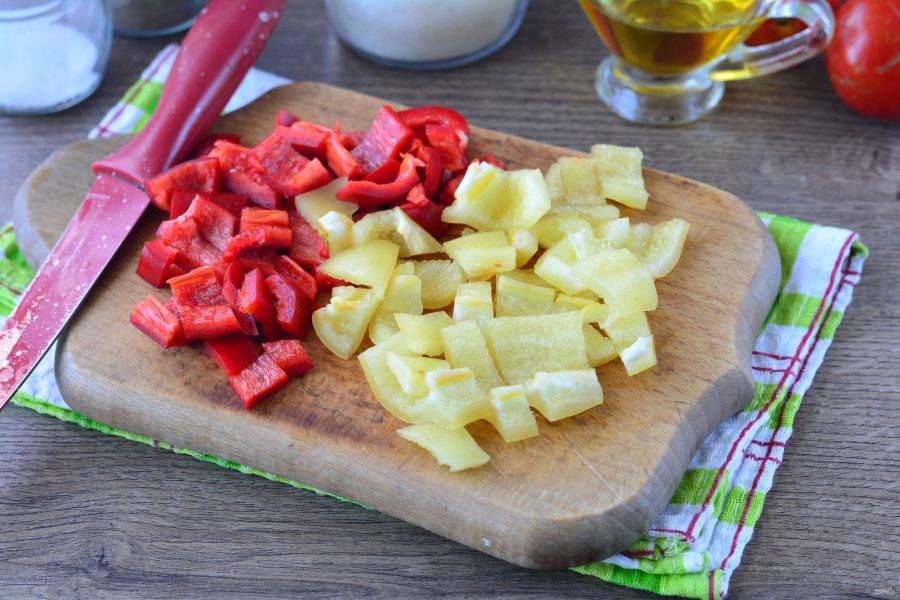 Почистите болгарский перец от семян и нарежьте средними кубиками. Перец используйте любого цвета — зеленого, желтого или красного.