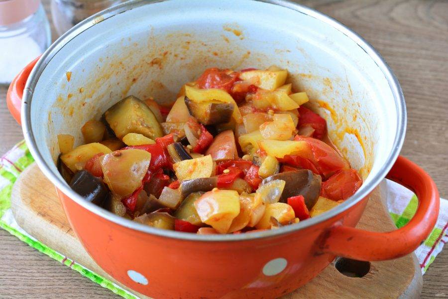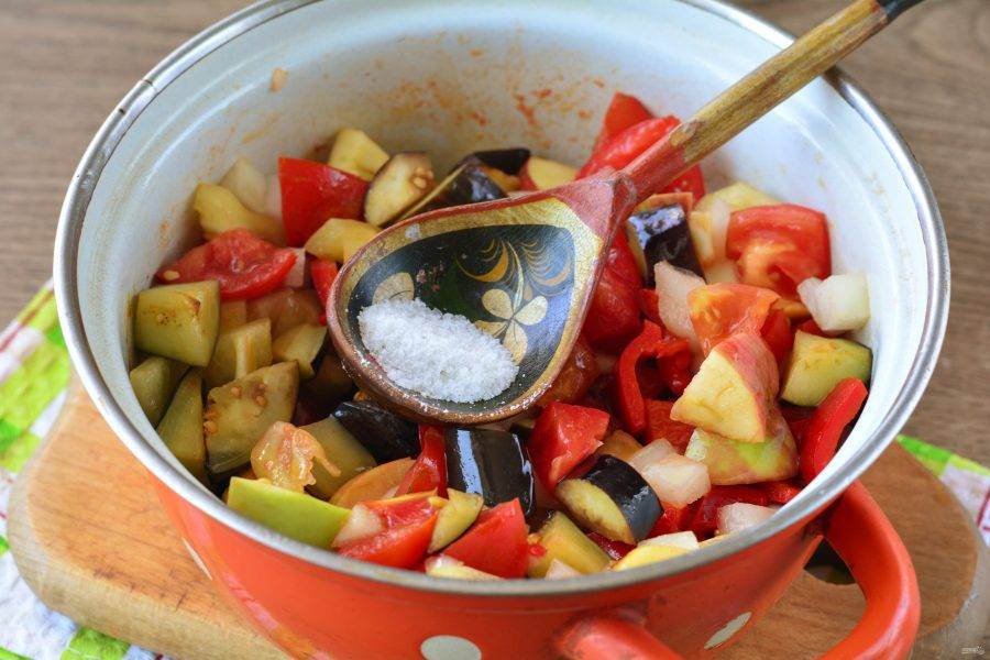 Через 10 минут всыпьте сахар и соль, перемешайте, тушите овощи еще 10-15 минут.
