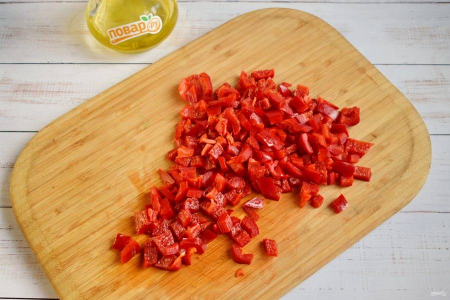 Сладкий перец разрежьте пополам, удалите семена, нарежьте кубиками.