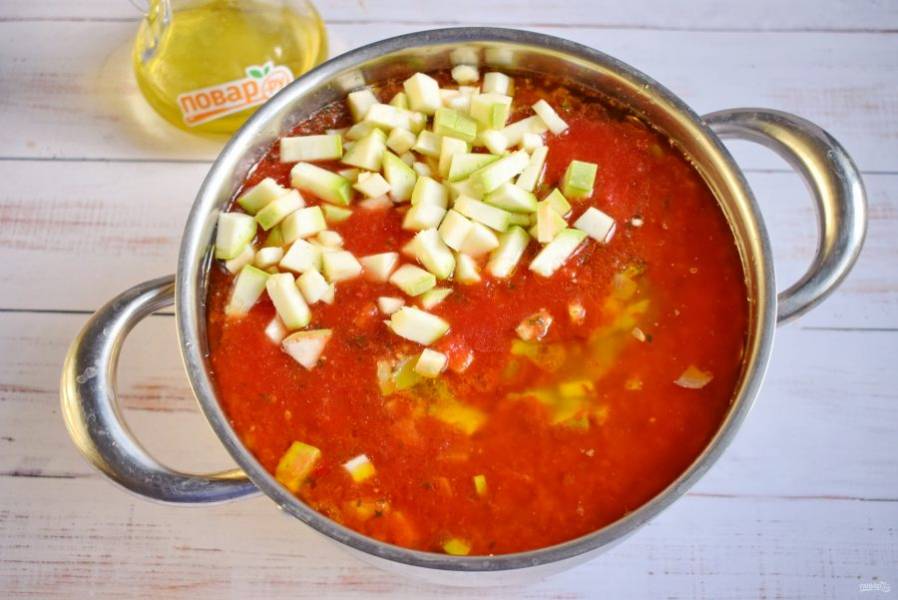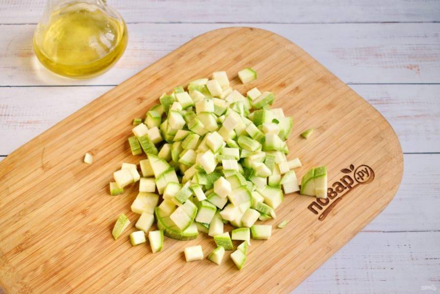 Кабачки при необходимости очистите от жесткой кожицы и семян. Молодые кабачки сразу нарежьте кубиками.